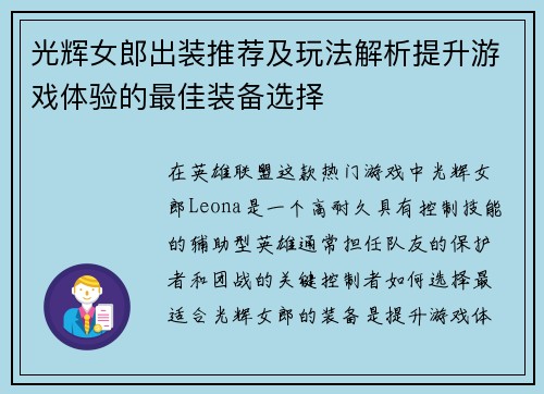 文章摘要:在《英雄联盟》中,发条魔灵是一位拥有强大控制与输出能力的法师型英雄,凭借其独特的技能机制与高机动性,在战斗中扮演着至关重要的角色。本文将从四个方面详细分析发条魔灵的出装推荐与实战技巧,帮助玩家掌控战局,获得更好的游戏体验。首先,本文将探讨发条魔灵的核心装备选择,通过分析各类装备的属性与适用...